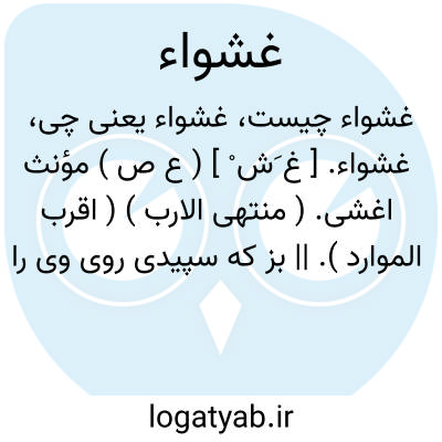 غشواء. [ غ َش ْ ] ( ع ص ) مؤنث اغشی. ( منتهی الارب ) ( اقرب الموارد ). || بز که سپیدی روی وی را بپوشد. ( منتهی الارب ) ( آنندراج ). آن گوسفند که روی او سفید بود. ( مهذب الاسماء ). || اسب ماده سپیدسر. ( منتهی الارب ) ( آنندراج ). غشواء. از خیل و جز آن، آن است که سفیدی روی او را بپوشد یا اینکه فقط سرش سفید باشد و آن مؤنث اغشی است. ( اقرب الموارد ). || اسپی است. ( منتهی الارب ) ( آنندراج ) ( اقرب الموارد ).