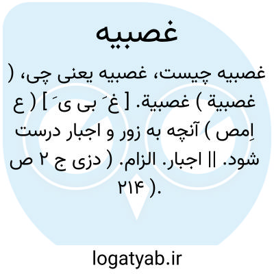 ( غصبیة ) غصبیة. [ غ َ بی ی َ ] ( ع اِمص ) آنچه به زور و اجبار درست شود. || اجبار. الزام. ( دزی ج 2 ص 214 ).