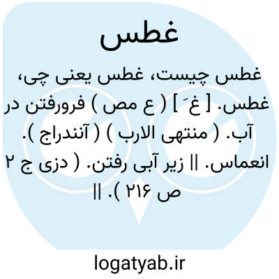 غطس. [ غ َ ] ( ع مص ) فرورفتن در آب. ( منتهی الارب ) ( آنندراج ). انعماس. || زیر آبی رفتن. ( دزی ج 2 ص 216 ). || فروبردن در آب. ( منتهی الارب ) ( آنندراج ). غمس. ( اقرب الموارد ). به آب فروبردن کسی را. ( تاج المصادر بیهقی ). به آب فروبردن. ( مصادر زوزنی ). فروبردن. نهان کردن. ( دزی ج 2 ص 216 ). || به دهان خوردن آب را. ( منتهی الارب ). به دهان آب خوردن از ظرف: غطس فی الاناء غطساً؛ کرع فیه. ( اقرب الموارد ). || بردن کسی را مرگ. ( منتهی الارب ). غطس به اللجم، ذهبت به المنیة، لغة فی عطست بالعین المهملة. ( اقرب الموارد ). || مجازاً به معنی گریختن و رهایی بخشیدن خود از خطر و نزاع. ( دزی ج 2 ص 216 ).