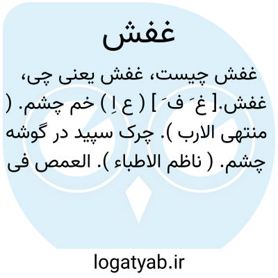 لغت نامه دهخدا غفش.[ غ َ ف َ ] ( ع اِ ) خم چشم. ( منتهی الارب ). چرک سپید در گوشه چشم. ( ناظم الاطباء ). العمص فی العین. ( اقرب الموارد ) ( قطر المحیط ).غفش. [ غ َ ] ( اِ ) هرچیز گنده و محکم و استوار و سخت پیچیده شده. ( ناظم الاطباء ).