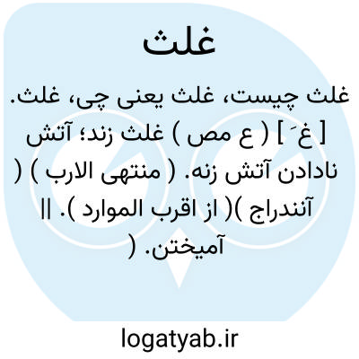 غلث. [ غ َ ل ِ ] ( ع ص ) مرد سخت پیکار. ( منتهی الارب ) ( آنندراج ). الشدیدالقتال. ( اقرب الموارد ). آنکه سخت کارزار کند. ( مهذب الاسماء ). || دیوانه. ( منتهی الارب ) ( آنندراج ). مجنون. ( اقرب الموارد ). || آنکه او را از طعام و شراب نشأه، و از غلبه خواب تمایلی و سستیی باشد. ( منتهی الارب ) ( آنندراج ). کسی که از خوردنی و نوشیدنی نشأه ای و از غلبه خواب میل کردن و شکستگی داشته باشد. ( از اقرب الموارد ). || الشدید اللزوم لمن طالب: آنکه سخت ملازم دوست خود باشد. ( اقرب الموارد ). || غلث از طعام؛ آنچه سنگ ریزه و کاه و جز آن داشته باشد. ( از اقرب الموارد ). تصفیه نشده، آنچه تمیز و مصفی نباشد. ( دزی ج 2 ص 221 ).