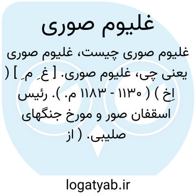 لغت نامه دهخدا غلیوم صوری. [ غ ِ م ِ ] ( اِخ ) ( 1130 - 1183 م. ). رئیس اسقفان صور و مورخ جنگهای صلیبی. ( از اعلام المنجد ).