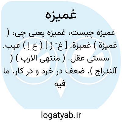 ( غمیزة ) غمیزة. [ غ َ زَ ] ( ع اِ ) عیب. سستی عقل. ( منتهی الارب ) ( آنندراج ). ضعف در خرد و در کار. ما فیه غمیزة؛ یعنی در او جای طعن و جای طمع نیست. ( از اقرب الموارد ). نقطه ضعف. عیبی که بدان بر کسی بتازند.