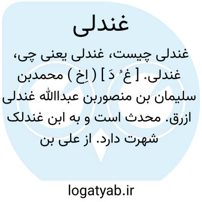 غندلی. [ غ ُ دَ ] ( اِخ ) محمدبن سلیمان بن منصوربن عبداﷲ غندلی ازرق. محدث است و به ابن غندلک شهرت دارد. از علی بن اسماعیل بن ابی نجم روایت کند. و ابوالفتح بن مسرور بلخی از او روایت دارد. وی ثقه بود. ( از اللباب فی تهذیب الانساب ج 2 ص 180 ) ( تاج العروس ).