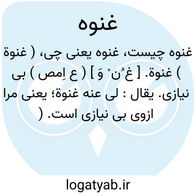 ( غنوة ) غنوة. [ غ ُن ْ وَ ] ( ع اِمص ) بی نیازی. یقال: لی عنه غنوة؛ یعنی مرا ازوی بی نیازی است. ( از منتهی الارب ) ( اقرب الموارد ).