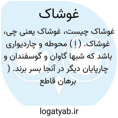 غوشاک. ( اِ ) محوطه و چاردیواری باشد که شبها گاوان و گوسفندان و چارپایان دیگر در آنجا بسر برند. ( برهان قاطع ). غوشا. ( برهان قاطع ) ( فرهنگ جهانگیری ). غوشاد. غوشای. ( برهان قاطع ) ( آنندراج ) ( فرهنگ رشیدی ). || سرگین خشک حیوانات. غوشا. غوشاد. غوشای. ( برهان قاطع ) ( آنندراج ) ( فرهنگ رشیدی ). پاچک. ( فرهنگ جهانگیری ).
