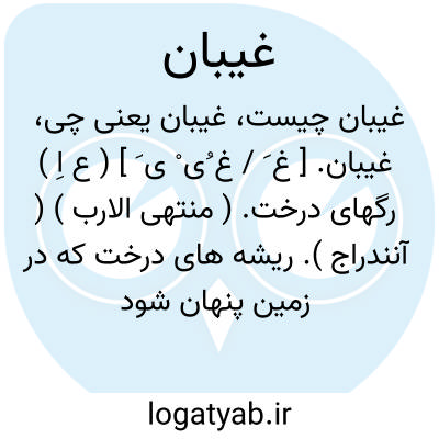 غیبان. [ غ َ / غ ُی ْ ی َ ] ( ع اِ ) رگهای درخت. ( منتهی الارب ) ( آنندراج ). ریشه های درخت که در زمین پنهان شود و چون بکنند آشکار گردد. یقال: بدا غَیَّبان ُ العود؛ یعنی آشکار شد عروق درخت که نهان بود، و آن هنگامی است که باران سخت بدان رسد و سیل جاری گردد و ریشه های درخت را بکند و عروق آن وآنچه را نهفته شده است آشکار سازد. ( از لسان العرب از ذیل اقرب الموارد ). غَیاب. غَیّاب. || آنچه آفتاب بدان نرسد از گیاه. ( از اقرب الموارد ).