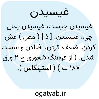 لغت نامه دهخدا غیسیدن. [ دَ ] ( مص ) غش کردن. ضعف کردن. افتادن و سست شدن. ( از فرهنگ شعوری ج 2 ورق 187 ب ) ( استینگاس ).