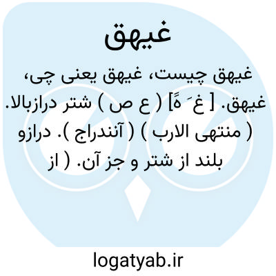 غیهق. [ غ َ هََ] ( ع ص ) شتر درازبالا. ( منتهی الارب ) ( آنندراج ). درازو بلند از شتر و جز آن. ( از اقرب الموارد ). || ( اِ ) شادمانی. ( منتهی الارب ) ( آنندراج ). نشاط. ( اقرب الموارد ). || دیوانگی، و این را به فربهی و پرگوشتی وصف آرند. الجنون، و یوصف به العظم و الترارة کقوله: و للشباب شرة و غیهق. ( از منتهی الارب ) ( از اقرب الموارد ).