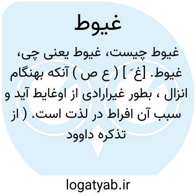 غیوط. [غ َ ] ( ع ص ) آنکه بهنگام انزال، بطور غیرارادی از اوغایط آید و سبب آن افراط در لذت است. ( از تذکره داوود ضریر انطاکی ج 2 ص 186 ). رجوع به همین کتاب شود.