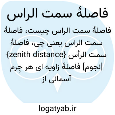 فرهنگستان زبان و ادب فاصلۀ سمت الرأس{zenith distance} [نجوم] فاصلۀ زاویه ای هر جِرم آسمانی از نقطۀ سمت الرأس که متمم ارتفاع جِرم است