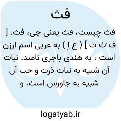 فث. [ ف َث ث ] ( ع اِ ) به عربی اسم ارزن است، به هندی باجری نامند. نبات آن شبیه به نبات ذرت و حب آن شبیه به جاورس است. و اهل هند آن را بسیار میخورند نان آن پخته و دیگر انواع. ( فهرست مخزن الادویه ). گیاهی است که در خشکسال نان دانه آن خورند یا آن را بپزند و بخورند. || درخت حنظل. ( منتهی الارب ) ( اقرب الموارد ). || درختی که در دشتها و بیشه ها روید و دانه اش مانند نخود است. ( اقرب الموارد ). || ( ص ) پراکنده: تمر فث؛ خرمای پراکنده. || ( مص ) پراکنده کردن حیوان پشکل خود را. ( از منتهی الارب ).