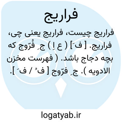 فراریج. [ ف َ] ( ع اِ ) ج ِ فُرّوج که بچه دجاج باشد. ( فهرست مخزن الادویه ). ج ِ فرّوج [ ف ُ / ف َ ]. ( اقرب الموارد ).