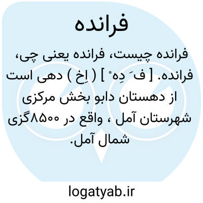 فرانده. [ ف َ دِه ْ ] ( اِخ ) دهی است از دهستان دابو بخش مرکزی شهرستان آمل، واقع در 8500گزی شمال آمل. ناحیه ای است واقع در دشت، معتدل مرطوب و دارای 230 تن سکنه است. از رودخانه هراز مشروب میشود. محصولاتش برنج، کنف و صیفی است. اهالی به کشاورزی گذران میکنند.راه مالرو دارد. ( از فرهنگ جغرافیایی ایران ج 3 ).
