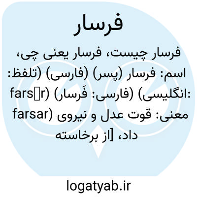 اسم: فرسار (پسر) (فارسی) (تلفظ: farsār) (فارسی: فَرسار) (انگلیسی: farsar) معنی: قوت عدل و نیروی داد، [از برخاسته های دساتیر ـ برهان چ، معین]
