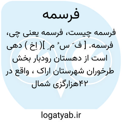 فرسمه. [ ف َ س ُ م ِ ]( اِخ ) دهی است از دهستان رودبار بخش طرخوران شهرستان اراک، واقع در 42هزارگزی شمال باختری طرخوران و 3هزارگزی طریزآباد. ناحیه ای است واقع در دامنه، سردسیرو دارای 69 تن سکنه است. از چشمه مشروب میشود. محصولاتش غلات و بنشن است. اهالی به کشاورزی گذران می کنند.راه مالرو دارد. ( از فرهنگ جغرافیایی ایران ج 2 ).