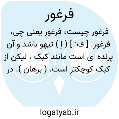 فرغور. [ ف َ ] ( اِ ) تیهو باشد و آن پرنده ای است مانند کبک، لیکن از کبک کوچکتر است. ( برهان ). در جهانگیری فرفور ضبط شده است. رجوع به فرفور شود. || جل و آن پرنده ای باشد کاکل دار شبیه به گنجشک و اندکی از گنجشک بزرگتر. ( برهان ). || غوک را نیز گویند که وزق باشد و به عربی ضفدع خوانند. ( برهان ). رجوع به فرفور شود.