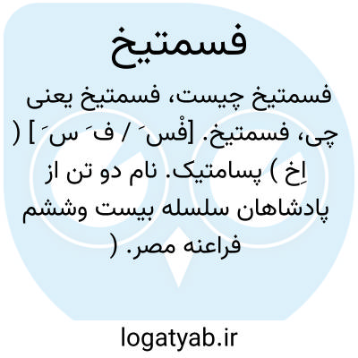 فسمتیخ. [فْس َ / ف َ س َ ] ( اِخ ) پسامتیک. نام دو تن از پادشاهان سلسله بیست وششم فراعنه مصر. ( از ایران باستان تألیف پیرنیا ص 182 به بعد ). رجوع به پسامتیک شود.