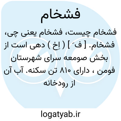 لغت نامه دهخدا فشخام. [ ف َ ] ( اِخ ) دهی است از بخش صومعه سرای شهرستان فومن، دارای 810 تن سکنه. آب آن از رودخانه ماسوله و محصول عمده اش برنج، توتون و مختصری ابریشم است. ( از فرهنگ جغرافیایی ایران ج 2 ).