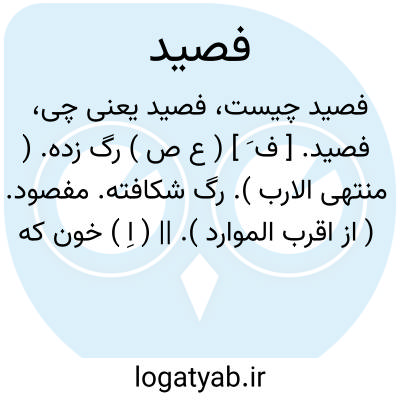 فصید. [ ف َ ] ( ع ص ) رگ زده. ( منتهی الارب ). رگ شکافته. مفصود. ( از اقرب الموارد ). || ( اِ ) خون که در روده بریان کرده خوردندی و هم جهت مهمان داشتندی در ایام جاهلیت. ( منتهی الارب ) ( از اقرب الموارد ).