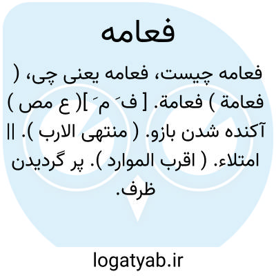 ( فعامة ) فعامة. [ ف َ م َ ]( ع مص ) آکنده شدن بازو. ( منتهی الارب ). || امتلاء. ( اقرب الموارد ). پر گردیدن ظرف. ( منتهی الارب ). || هموار و معتدل و تمام خلقت گشتن زن وبزرگ شدن ساق آن. ( منتهی الارب ) ( از اقرب الموارد ). || پر و فربه شدن. ( تاج المصادر بیهقی ).