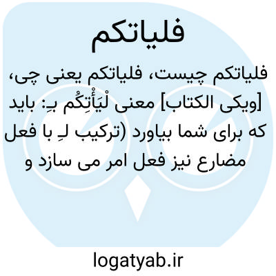 [ویکی الکتاب] معنی لْیَأْتِکُم بـِ: باید که برای شما بیاورد (ترکیب لـِ با فعل مضارع نیز فعل امر می سازد و چنانچه قبل از آن حروف ربط "وَ"،"ثُمَّ" یا "فـَ" بیاید، این لام ساکن می شود مثل "فَلْیَأْتِکُم ")
