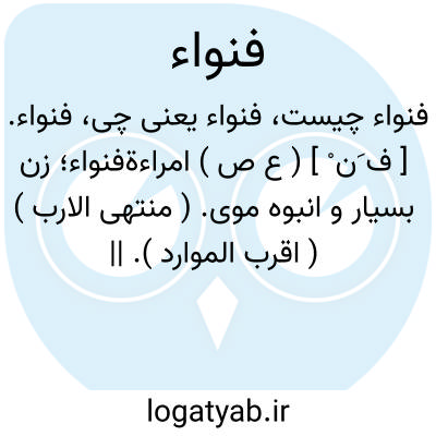 فنواء. [ ف َن ْ ] ( ع ص ) امراءةفنواء؛ زن بسیار و انبوه موی. ( منتهی الارب ) ( اقرب الموارد ). || شجرة فنواء؛ درخت بسیارشاخ فراخ سایه. ( منتهی الارب ). فَنّاء است و نون دوم به واو بدل شده است. ( از اقرب الموارد ). رجوع به فنن شود.