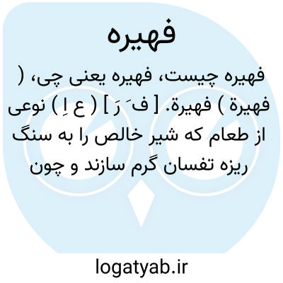 ( فهیرة ) فهیرة. [ ف َ رَ ] ( ع اِ ) نوعی از طعام که شیر خالص را به سنگ ریزه تفسان گرم سازند و چون به جوش آید آرد بر آن ریخته ترتیب دهند. ( منتهی الارب ). با قاف هم آمده است. ( اقرب الموارد ).