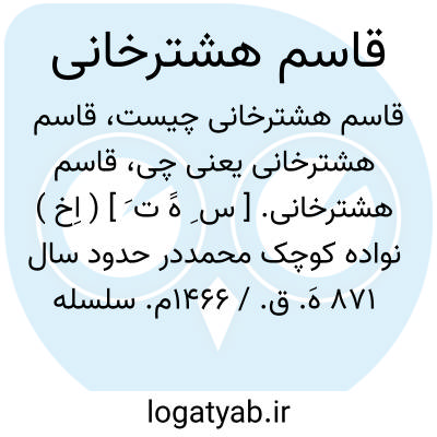 قاسم هشترخانی. [ س ِ هََ ت َ ] ( اِخ ) نواده کوچک محمددر حدود سال 871 هَ. ق. / 1466م. سلسله خانان هشترخان را تشکیل داد. قاسم رئیس خاندان اردا یک شعبه از قبیله سیراردو بود. فرزندان او تا سال 962 هَ. ق./ 1554 م. امارت داشتند و امیرکبیر مسکو ایشان را از استقلال انداخت. قلمرو حکومت آنان دشت قبچاق بوده است. ( ترجمه طبقات سلاطین اسلام چ 1312 تهران ص 204 ).