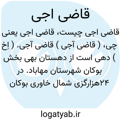 ( قاضی آجی ) قاضی آجی. ( اِخ ) دهی است از دهستان بهی بخش بوکان شهرستان مهاباد. در 24هزارگزی شمال خاوری بوکان و 18هزارگزی شمال خاوری شوسه بوکان به میاندوآب واقع و موقع جغرافیائی آن کوهستانی و معتدل سالم است. 110 تن سکنه دارد. آب آن از چشمه، محصول آن غلات، توتون، حبوبات، شغل اهالی زراعت و گله داری و صنایع دستی آنان جاجیم بافی است. راه مالرو دارد. ( از فرهنگ جغرافیائی ایران ج 4 ).