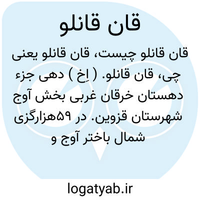 قان قانلو. ( اِخ ) دهی جزء دهستان خرقان غربی بخش آوج شهرستان قزوین. در 59هزارگزی شمال باختر آوج و 51هزارگزی راه عمومی، در دامنه واقع و هوای آن معتدل است. 256 تن سکنه دارد. آب آن از قنات و چشمه و محصول آن غلات، نخود، توتون چپق و عسل و شغل اهالی زراعت و قالی و جاجیم بافی است. راه مالرو دارد. از اهل شاهسون بندادی در تابستان حدود این ده می آیند. ( از فرهنگ جغرافیایی ایران ج 1 ).