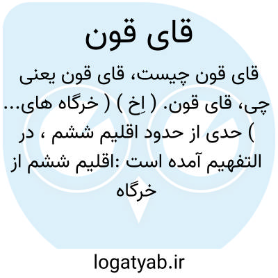 قای قون. ( اِخ ) ( خرگاه های... ) حدی از حدود اقلیم ششم، در التفهیم آمده است:اقلیم ششم از خرگاه های قای قون آغازد و بر خرخیز و تخرغز بگذرد سوی زمین ترکمانان و پاراب... ( التفهیم ص 200 ). رجوع به قای شود.