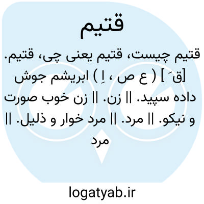 لغت نامه دهخدا قتیم. [ق َ ] ( ع ص، اِ ) ابریشم جوش داده سپید. || زن. || زن خوب صورت و نیکو. || مرد. || مرد خوار و ذلیل. || مرد کم طعام یا بی طعام. || نیزه و سنان باریک و کهنه. ( منتهی الارب ).