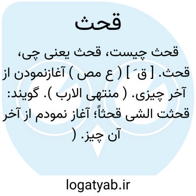 قحث. [ ق َ ] ( ع مص ) آغازنمودن از آخر چیزی. ( منتهی الارب ). گویند: قحثت الشی قحثاً؛ آغاز نمودم از آخر آن چیز. ( منتهی الارب ).