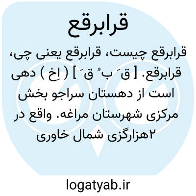 قرابرقع. [ ق َ ب ُ ق َ ] ( اِخ ) دهی است از دهستان سراجو بخش مرکزی شهرستان مراغه. واقع در 2هزارگزی شمال خاوری مراغه و چهارهزارگزی شمال شوسه مراغه به میانه و موقع جغرافیایی آن جلگه، معتدل و سالم است. سکنه آن 160 تن و آب آن از صوفی چای و محصول آنجا غلات، حبوبات، پنبه، کشمش، بادام، کرچک، زردآلو و شغل اهالی زراعت و صنایع دستی آنان جاجیم بافی است. راه ارابه رو دارد. ( از فرهنگ جغرافیایی ایران ج 4 ).