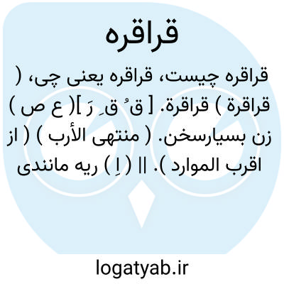 ( قراقرة ) قراقرة. [ ق ُ ق ِ رَ ]( ع ص ) زن بسیارسخن. ( منتهی الأرب ) ( از اقرب الموارد ). || ( اِ ) ریه مانندی که شتر وقت مستی از دهن برآرد. ( منتهی الأرب ). شقشقة. ( اقرب الموارد ).