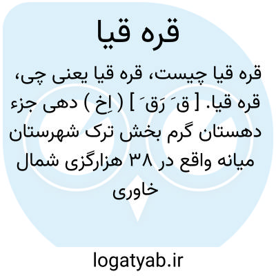 قره قیا. [ ق َ رَق َ ] ( اِخ ) دهی جزء دهستان گرم بخش ترک شهرستان میانه واقع در 38 هزارگزی شمال خاوری بخش و 33 هزارگزی شوسه میانه به خلخال. موقع جغرافیایی آن کوهستانی ومعتدل است. سکنه آن 297 تن. آب آن از چشمه و کوه ومحصول آن غلات و عدس. شغل اهالی زراعت و گله داری است. راه مالرو دارد. ( از فرهنگ جغرافیایی ایران ج 4 ).