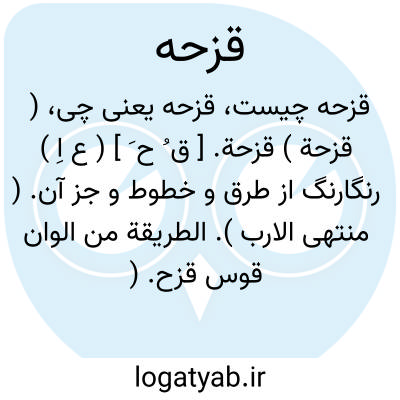 لغت نامه دهخدا ( قزحة ) قزحة. [ ق ُ ح َ ] ( ع اِ ) رنگارنگ از طرق و خطوط و جز آن. ( منتهی الارب ). الطریقة من الوان قوس قزح. ( اقرب الموارد ) ( المنجد ). ج، قُزَح. ( اقرب الموارد ).