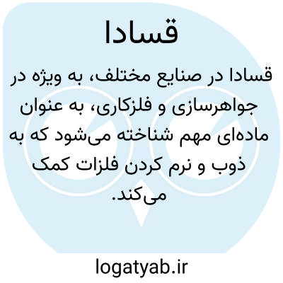 کلمه «قسادا» به معنای نوعی دارو است که به عنوان تنکار شناخته میشود. این دارو برای پیوند دادن طلا، نقره، مس و برنج با یکدیگر استفاده میشود و میتواند به دو شکل معدنی و مصنوعی تهیه شود. قسادا در صنایع مختلف، به ویژه در جواهرسازی و فلزکاری، به عنوان مادهای مهم شناخته میشود که به ذوب و نرم کردن فلزات کمک میکند.