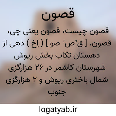 قصون. [ ق ُص ْ صو ] ( اِخ ) دهی از دهستان تکاب بخش ریوش شهرستان کاشمر در 26 هزارگزی شمال باختری ریوش و 2 هزارگزی جنوب مالرو عمومی ریوش. موقع آن کوهستانی و معتدل است. سکنه آن 225 تن است. آب آن از قنات و محصول آن غلات و شغل اهالی زراعت است. راه مالرو دارد. ( از فرهنگ جغرافیایی ایران ج 9 ).