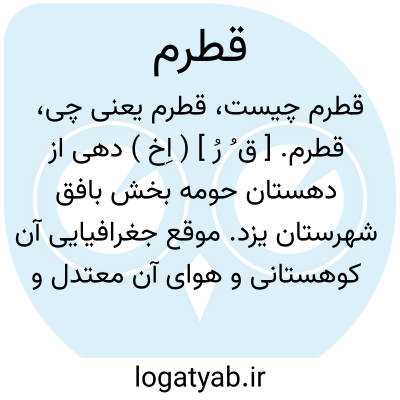قطرم. [ ق ُ رُ ] ( اِخ ) دهی از دهستان حومه بخش بافق شهرستان یزد. موقع جغرافیایی آن کوهستانی و هوای آن معتدل و سکنه ٔآن 420 تن است. آب آن از قنات و محصول آن غلات، برنج و شغل اهالی زراعت و صنایع دستی زنان کرباس بافی است. راه فرعی دارد. ( از فرهنگ جغرافیایی ایران ج 10 ).