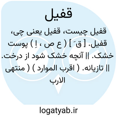 قفیل. [ ق َ ] ( ع ص، اِ ) پوست خشک. || آنچه خشک شود از درخت. || تازیانه. ( اقرب الموارد ) ( منتهی الارب ). || گلاب. ( منتهی الارب ). رجوع به قِفّیل شود. || راه کوه سنگ که دویدن را نشاید، گویا کوچه دربسته است. || گیاهی است. ( اقرب الموارد ) ( منتهی الارب ). قفیل. [ ق ِف ْ فی ] ( ع اِ ) گلاب. ( اقرب الموارد ). رجوع به قَفیل شود. قفیل. [ ق َ ] ( اِخ ) موضعی است ( منتهی الارب ) در سرزمین طی. زیدبن خیل در شعر خود که آن راپیش از مرگش سروده از آن یاد کند. ( معجم البلدان ).
