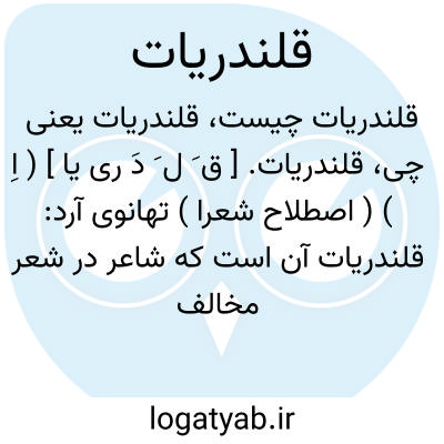 قلندریات. [ ق َ ل َ دَ ری یا ] ( اِ ) ( اصطلاح شعرا ) تهانوی آرد: قلندریات آن است که شاعر در شعر مخالف عرف و عادت آرد و ترک مبالات کند هرچه از آن احتراز شاید بر آن اقدام کند و اوصاف اهل صلاح عار کند بل ظاهر شریعت رامخالفت از کمال پندارد و موجب ترقی انگارد مانند: