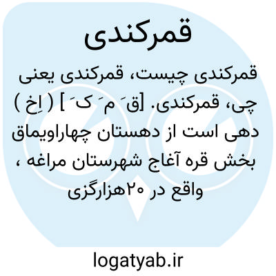قمرکندی. [ق َ م َ ک َ ] ( اِخ ) دهی است از دهستان چهاراویماق بخش قره آغاج شهرستان مراغه، واقع در 20هزارگزی شمال باختری قره آغاج و 6هزارگزی جنوب شوسه مراغه به میانه. موقع جغرافیائی آن کوهستانی و معتدل است. سکنه آن 386 تن است. آب آن از قنات و محصول آن غلات، نخود، بزرک و شغل اهالی زراعت و صنایعدستی زنان جاجیم بافی است. راه مالرو دارد. ( از فرهنگ جغرافیایی ایران ج 4 ).