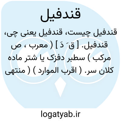 لغت نامه دهخدا قندفیل. [ ق َ دَ ] ( معرب، ص مرکب ) سطبر دفزک یا شتر ماده کلان سر. ( اقرب الموارد ) ( منتهی الارب ) ( ناظم الاطباء ). معرب است. ( اقرب الموارد ). معرب گنده فیل است. ( منتهی الارب ) ( آنندراج ) ( المعرب جوالیقی ص 272 ).
