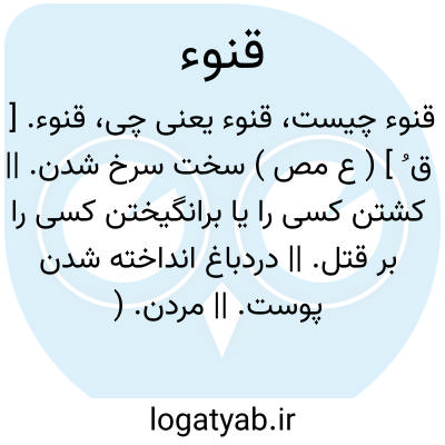 قنوء. [ ق ُ ] ( ع مص ) سخت سرخ شدن. || کشتن کسی را یا برانگیختن کسی را بر قتل. || دردباغ انداخته شدن پوست. || مردن. ( از اقرب الموارد ) ( منتهی الارب ). || فاسد شدن. ( از اقرب الموارد ). تباه گردیدن پوست. ( منتهی الارب ).
