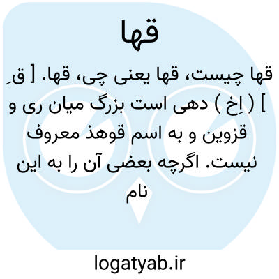قها. [ ق ِ ] ( اِخ ) دهی است بزرگ میان ری و قزوین و به اسم قوهذ معروف نیست. اگرچه بعضی آن را به این نام نیز میخوانند. ( از معجم البلدان ).