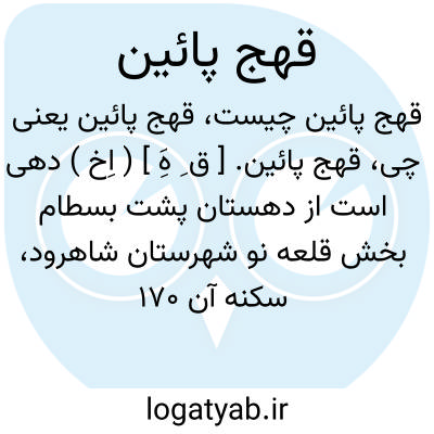 قهج پائین. [ ق ِ هَِ ] ( اِخ ) دهی است از دهستان پشت بسطام بخش قلعه نو شهرستان شاهرود، سکنه آن 170 تن. آب آن از قنات. محصول آن غلات، بنشن، میوه جات و شغل اهالی آنجا زراعت و گله داری است.راه مالرو دارد. ( از فرهنگ جغرافیایی ایران ج 3 ).