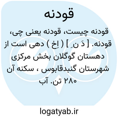 قودنه. [ دَ ن ِ ] ( اِخ ) دهی است از دهستان گوگلان بخش مرکزی شهرستان گنبدقابوس، سکنه آن 280 تن. آب آن از چشمه و محصول آن غلات، لبنیات، حبوب و ابریشم. شغل اهالی زراعت و گله داری و صنایع دستی زنان آنجا بافتن پارچه های ابریشمی است. راه مالرو دارد. ( از فرهنگ جغرافیایی ایران ج 3 ).