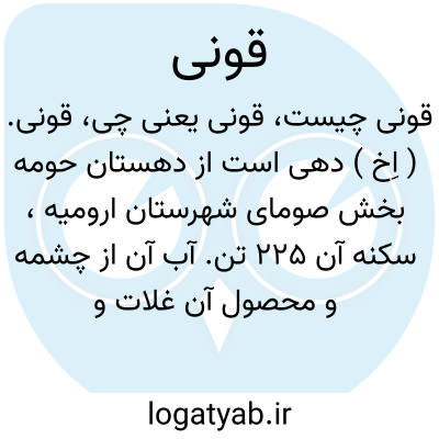 قونی. ( اِخ ) دهی است از دهستان حومه بخش صومای شهرستان ارومیه، سکنه آن 225 تن. آب آن از چشمه و محصول آن غلات و توتون. شغل اهالی زراعت، گله داری و صنایع دستی زنان آنجا جاجیم بافی است.راه مالرو دارد. ( از فرهنگ جغرافیایی ایران ج 4 ).